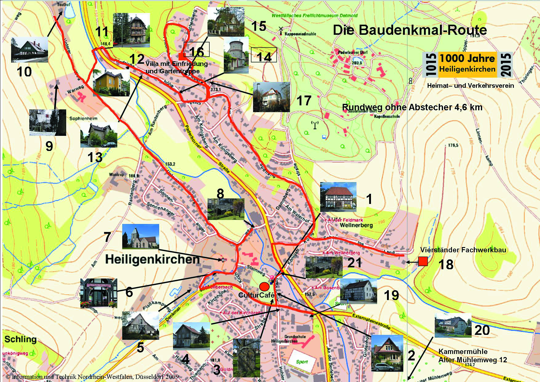 Die Baudenkmal-Route Heiligenkirchen Auf einer Strecke von 4,6 km kommen Sie an fast allen der 21 Baudenkmäler vorbei, zwei von ihnen erreichen Sie auf kleinen Abstechern. Die Karte finden Sie als pdf hier und als jpg hier. Die Erläuterungen finden Sie hier. Mehr Informationen über Baudenkmäler gibt es hier. Zur Kurzbeschreibung Das Faltblatt finden Sie hier.