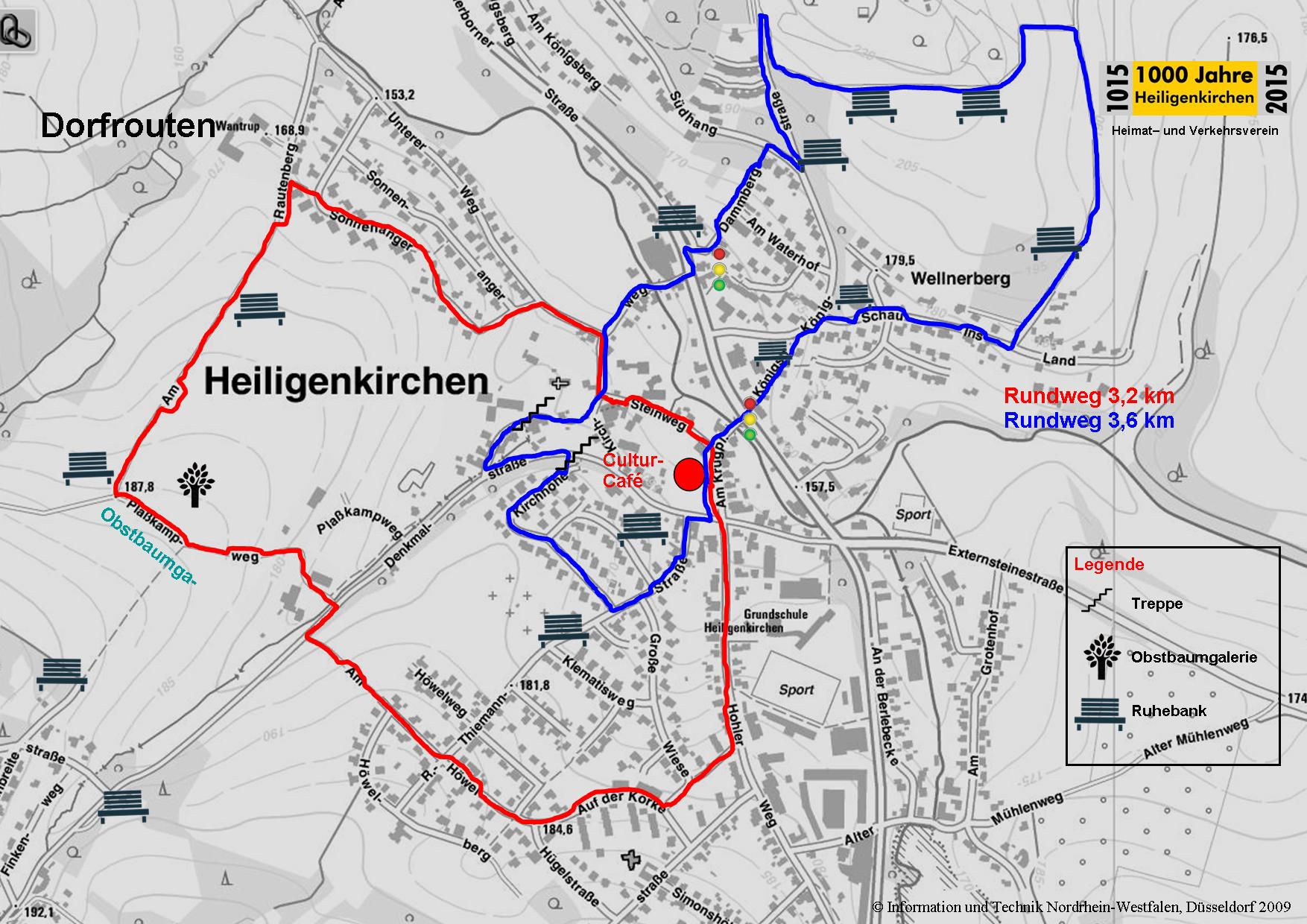2 Dorfrouten Vom Ortskern geht es auf der roten Route bis hin zur Obstbaumgalerie des Heimat- und Verkehrsvereins und parallel zum Unteren Weg zurück (3,2 km). Die blaue Route führt durch den Ortskern zum Königsberg. Die Wanderkarte mit beiden Routen finden Sie hier als pdf und hier als jpg.. Zur Beschreibung Das Faltblatt finden Sie hier. Zum kostenlosen Komoot-Track (rote Route) geht es hier.